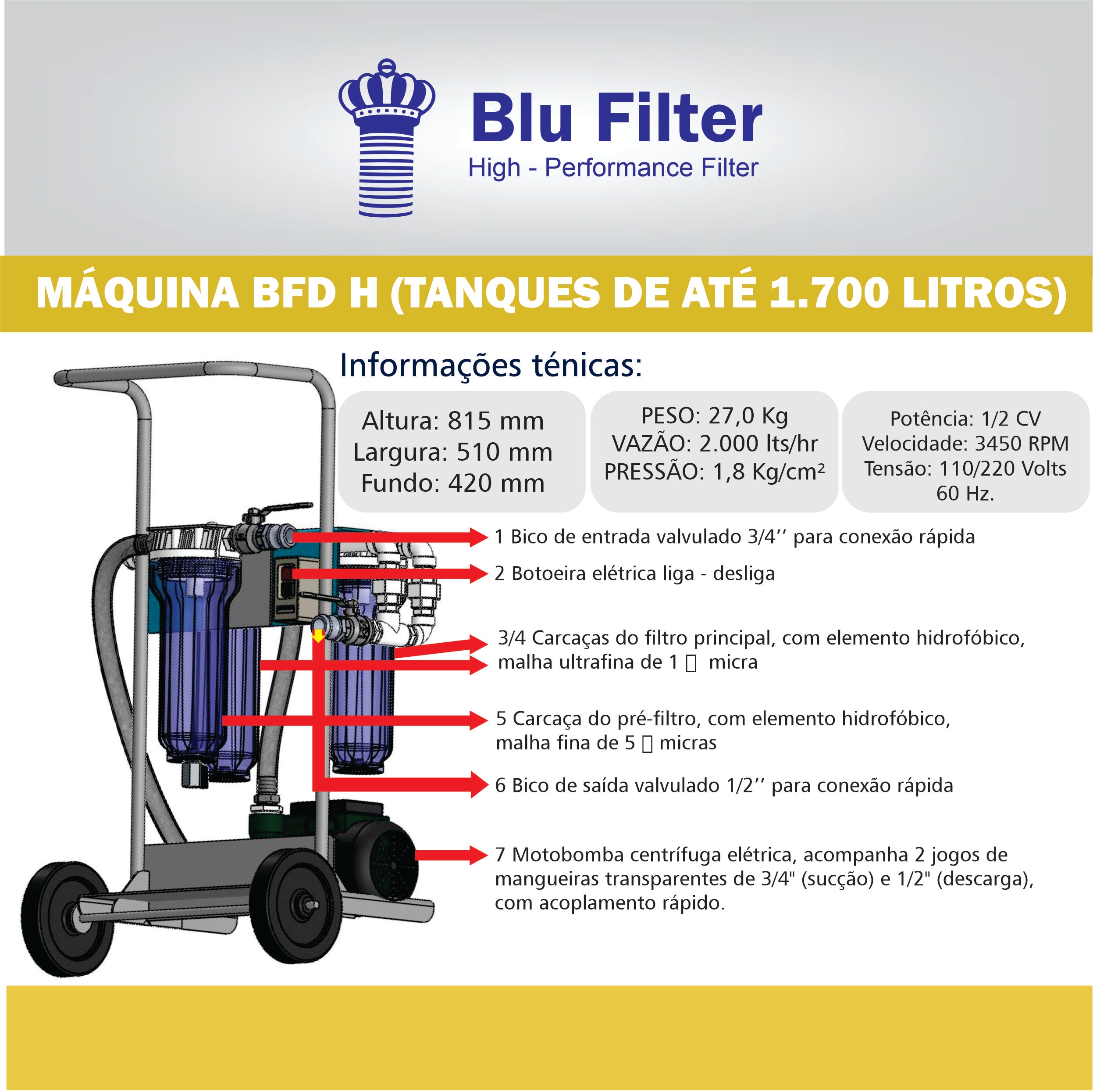 O Equipamento de filtração para diesel faz limpeza de tanques, ideal para aplicações em veículos leves e pesados, embarcações e grupos geradores. Sua capacidade de alta performance é de 2.400 L/h, podendo atender tanques com capacidade de até 1.700 litros.