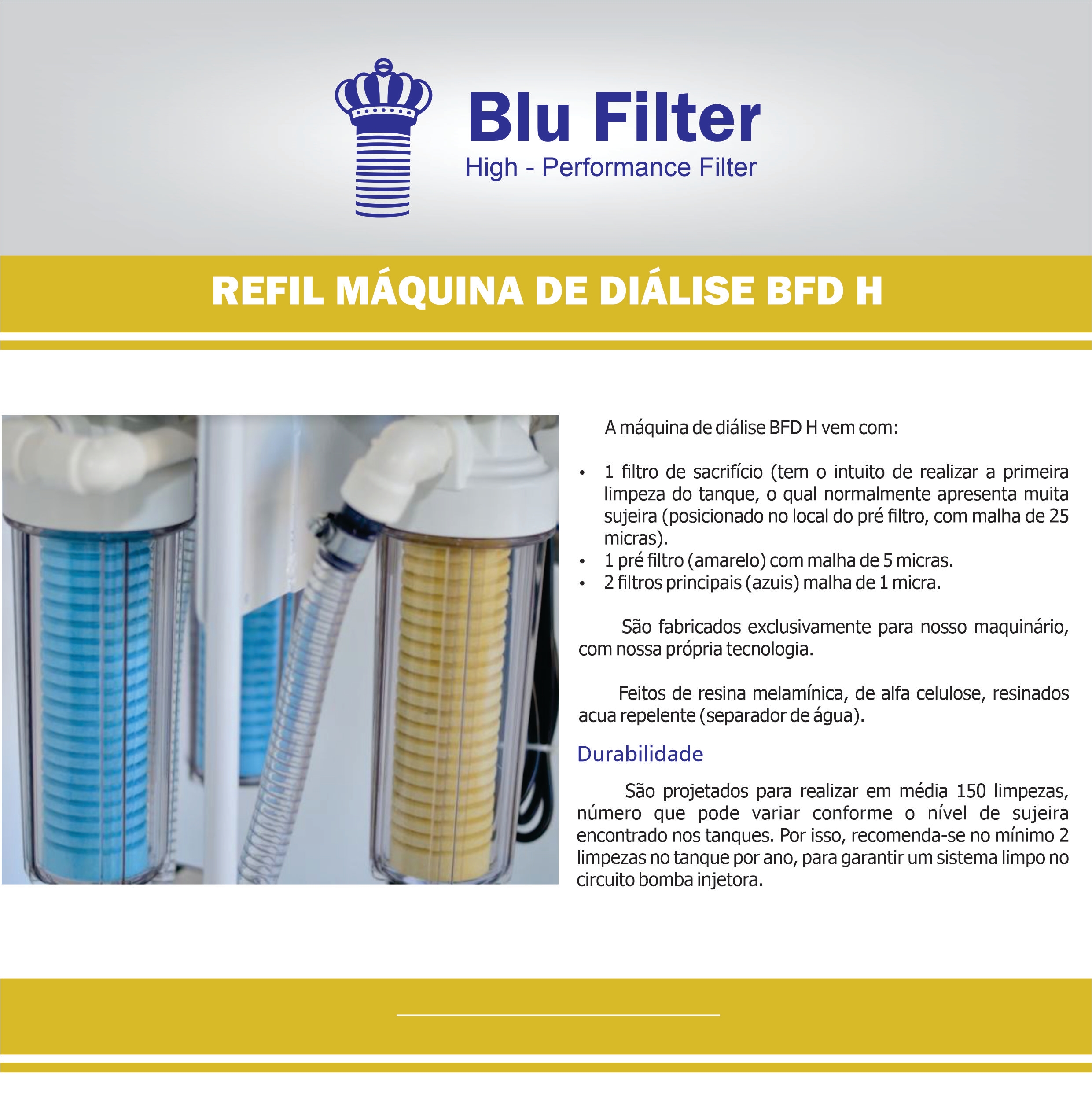 A média de 150 aplicações (Diálises) em tanques de 300 lts ou filtração para 45.000 lt a ser limpo, após saturação deve-se trocar o jogo de filtros.